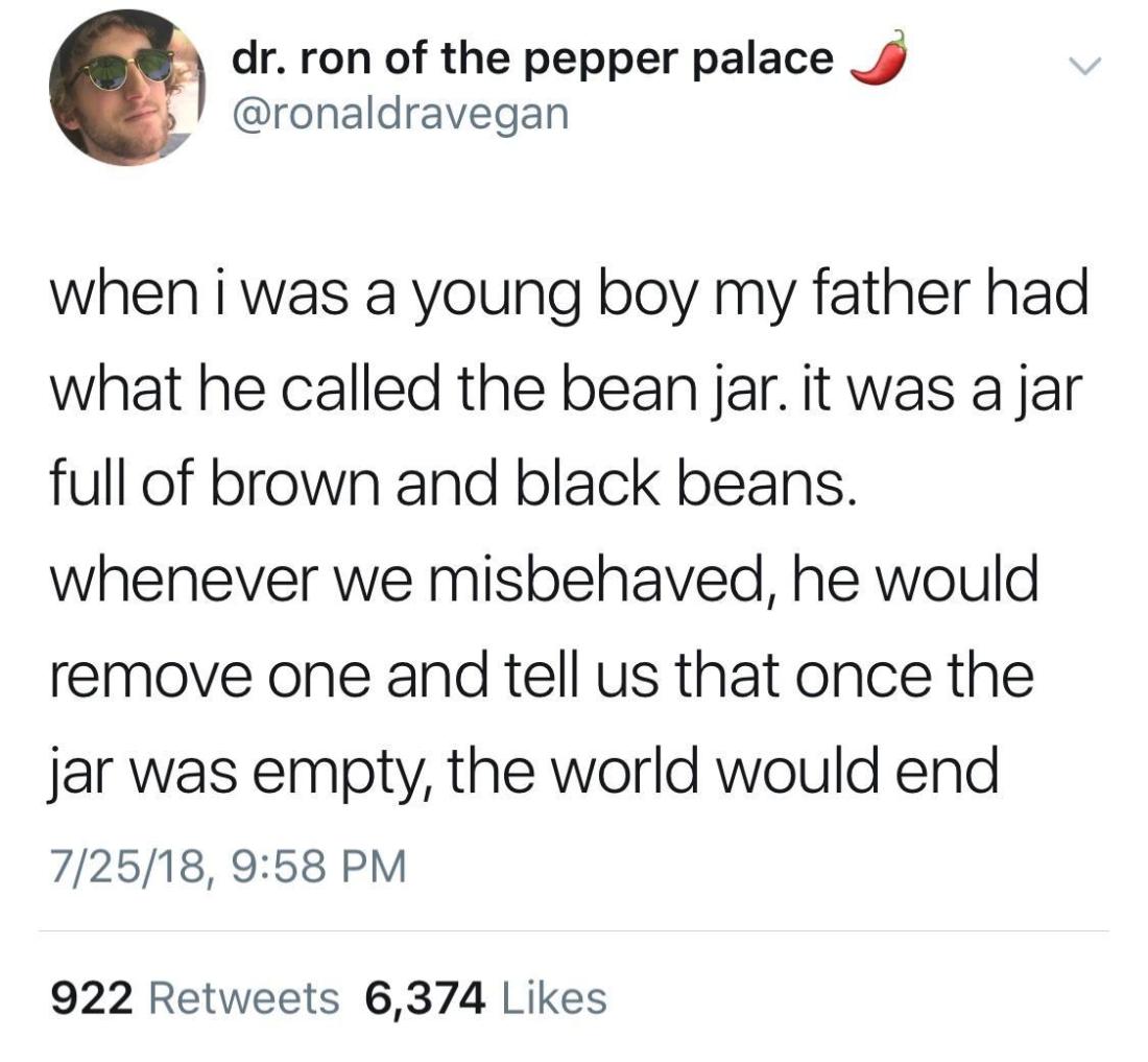 hueydeweylouieandthenews Uncategorized July 30, 2018December 8, 2018 1 Minute barreboy: whitepeopletwitter: The bean jar [My Chemical Romance voice]: When I was…. a young boy… my Father… had what he called the bean jar… Share this: Share on X (Opens in new window) X Share on Facebook (Opens in new window) Facebook Like Loading... Related Published by hueydeweylouieandthenews View all posts by hueydeweylouieandthenews Published July 30, 2018December 8, 2018
