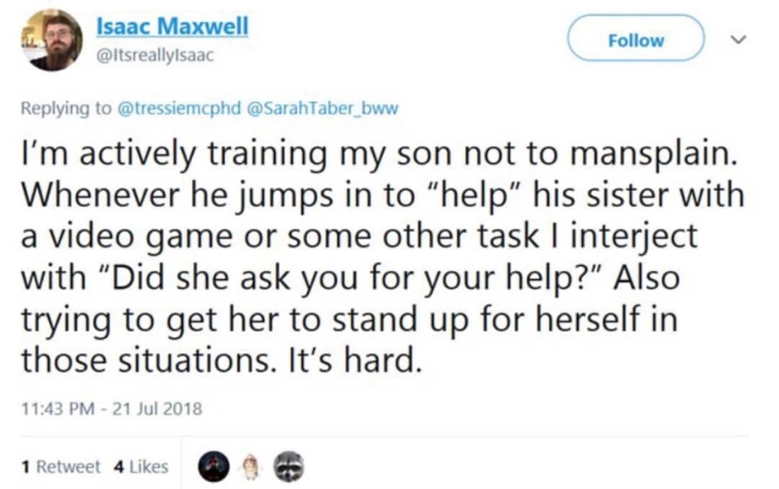Leave them alone. If he enjoys helping his sister, and she has no issues with him helping then there is no issue. Let them follow the path they are choosing. Heck it might even lead to them falling madly in love with each other who knows. Girls and boys falling into traditional gender roles is not a bad thing. He will become a great leader and father, and she will become a superb mother and if they do that together then you will have 2 kids who will love each other forever.