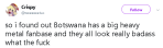 PS in Botswana metal heads are called Marok, and lady metalheads call themselves Queens and give themselves badass nicknames like Phoenix Death Serpent.