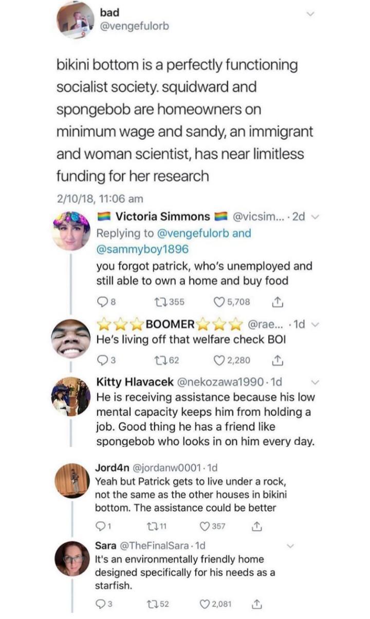 Hey remember that episode of Spongebob where Sandy sings about being homesick for Texas and Spongebob and Patrick overhear it and are worried that she’s going to leave Bikini Bottom so they have a Texas party at the Krusty Krab with all their friends, recreating things in Sandy’s song but they fuck it up like, pecan pie is just a can of peas shoved in a pie, barbeque is barbed wire in the shape of a Q, and the ten gallon hats are just plastic water jugs on their heads, and like…. Sandy just laughs so hard she breaks into tears, cause she sees what they’re trying to do for her to make her feel at home because they love her and don’t want her to leave…………… yo do you ever think about that goddamn episode
