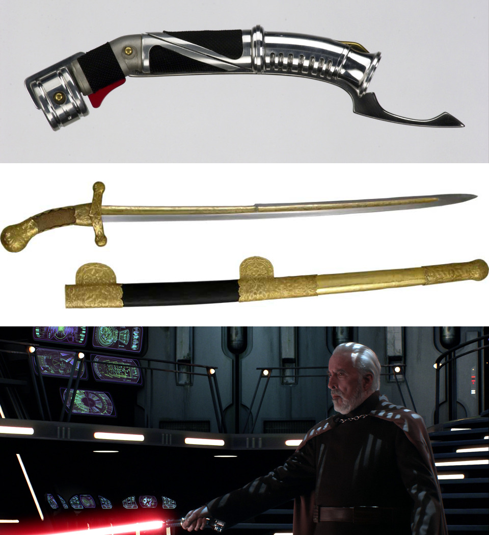 Count Dooku’s iconic curved lightsaber hilt is coincidentally similar to the curved hilt sabre of historic king and emperor Charlemagne, of whom Christopher Lee (who portrayed Count Dooku/Darth Tyranus) was a direct descendant.